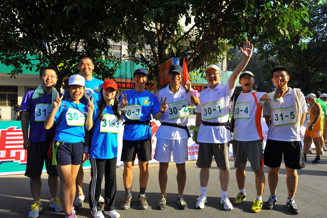 11月5日,秋陽燦爛,大家早已躍躍欲試,隊中負責后勤的我,早在比賽前夕就廣發(fā)注意帖:速干短褲、帽子、腰包、水杯、小方巾、鞋子等物品需必備;作為隊伍領頭雁的齊總則早已咨詢專業(yè)選手,提倡大家結合自己體力準備能量棒、巧克力等緊急能量品;隊長鄧總在了解路線和路況后,制定了“穩(wěn)重取勝”的戰(zhàn)略,采取了“準備活動做充足,先慢后快求適應,不因外因亂陣腳,敵疲我追求成績”的具體戰(zhàn)術;隊伍中的另一名隊員則帶來了他專業(yè)的GPS定位手表,分時段匯報所走路程、當前速度適當與否,并提前告知提速準備;我們的女隊友亞梅,則一路保持微笑,緊跟隊伍,偶爾爆出的一些冷笑話,讓緊張趕路的我們倍感清爽。