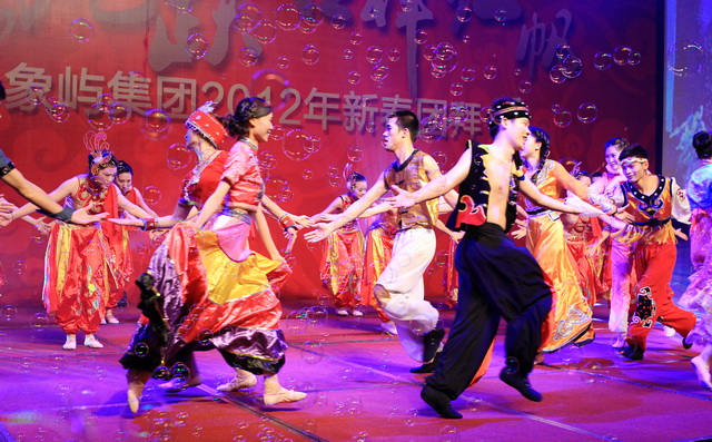 團(tuán)拜會(huì)上,象嶼人自編自導(dǎo)自演的春晚節(jié)目盛大登場(chǎng)。象嶼建設(shè)集團(tuán)獻(xiàn)演的歡慶歌舞《盛世中華》,身著民族節(jié)慶服飾的姑娘小伙們熱情奔放,氣勢(shì)恢弘;象嶼股份火辣的阿拉伯舞《美麗的姑娘賽比古兒》驚艷全場(chǎng),扭轉(zhuǎn),抖肩,甩胯,窈窕的姑娘們盡情地綻放著耀眼的青春;上海區(qū)域選送京劇《智斗》,叱咤上海灘的各位公司高管齊登戲臺(tái),無論是司令還是阿慶嫂,范兒倍足,調(diào)兒倍正,十足個(gè)性演繹,引發(fā)臺(tái)下叫好不斷;集團(tuán)公司聯(lián)合象嶼資產(chǎn)、象嶼配送、象嶼碼頭、象嶼建設(shè)表演的歌舞聯(lián)唱《歲月如歌》,高中基三級(jí)同臺(tái),老中青三代盡歡,不同風(fēng)格的歌舞串聯(lián),展現(xiàn)的是象嶼文化的包容與開創(chuàng);福建/南平象嶼公司逗趣的《小人舞》創(chuàng)意無限,傳神的表情映襯恰到好處的肢體動(dòng)作,笑點(diǎn)不斷,而很難想象的是每個(gè)人物都由雙人搭配,紅幕后是團(tuán)隊(duì)配合的默契;速傳物流活潑優(yōu)美的新疆舞《掀起你的蓋頭來》充滿戲劇色彩,群舞韻律動(dòng)感,對(duì)舞火花擦撞,多情的青年男女追尋著炙熱的愛情,也寓意著象嶼人勇于追求心中美好的向往。春晚在晨帆合唱團(tuán)歡快的《陽光進(jìn)行曲》中成功落下帷幕。團(tuán)拜會(huì)現(xiàn)場(chǎng)歡樂、祥和,晚宴期間穿插的抽獎(jiǎng)活動(dòng),更讓驚喜的歡呼尖叫聲接連不斷,公司為辛勤一年的員工們準(zhǔn)備的豐厚大禮,掀起現(xiàn)場(chǎng)一次又一次的高潮。
