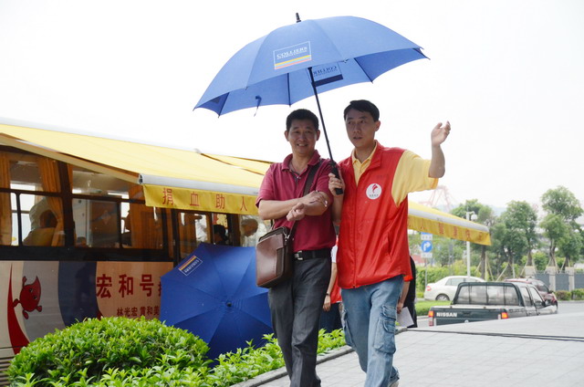 活動當(dāng)時時有小雨,志愿者熱心打傘護送獻(xiàn)血的愛心人士回大樓