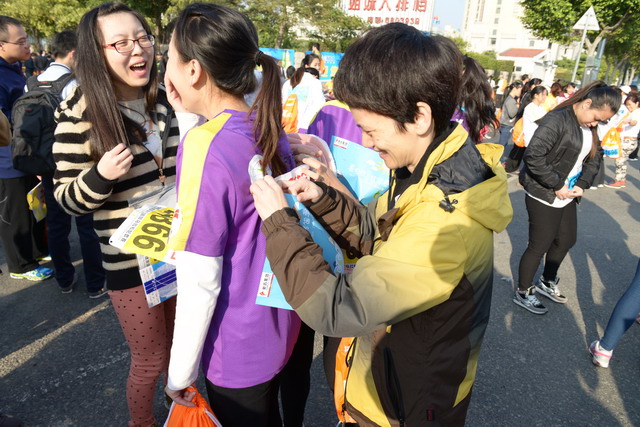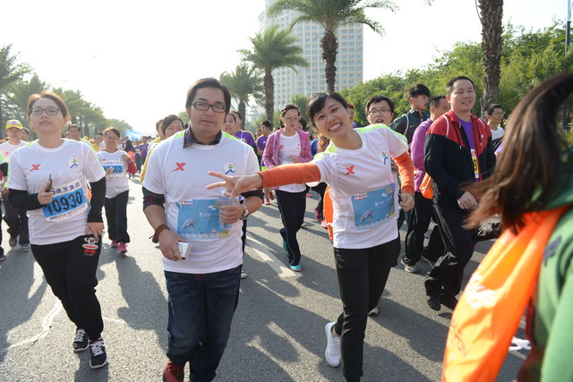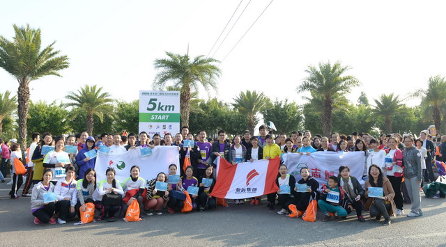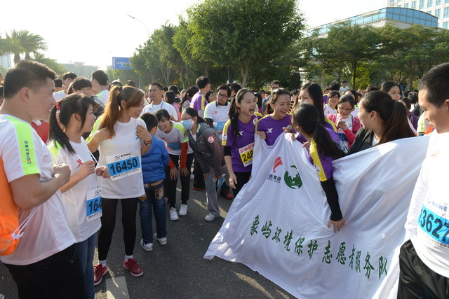 盡管冬日清晨有些凍人,但這絲毫沒(méi)有“凍”壞象嶼人的熱情。一進(jìn)入賽場(chǎng),大家就摩拳擦掌,躍躍欲試。今年的馬拉松對(duì)象嶼跑團(tuán)而言,有著特殊的意義,這不僅是一場(chǎng)健康跑,更是一場(chǎng)公益跑。此次比賽跑道恰好與火燒嶼隔海相望,由集團(tuán)捐資建立的中華白海豚救護(hù)繁育基地正坐落島上。白海豚的可愛(ài)形象也隨之出現(xiàn)在象嶼“跑男”“跑女”的前胸、后背。公益旗幟、白海豚公益宣傳貼紙,紅帆logo,以及我們朝氣蓬勃的象嶼跑團(tuán)組成了一道“有愛(ài)”的風(fēng)景線。這也吸引了周?chē)S多馬拉松參賽者的目光,有的參賽者甚至圍上前來(lái)詢(xún)問(wèn)是否也能加入其中。于是,象嶼救助白海豚的公益之舉隨著象嶼人的奔跑也一路傳播開(kāi)來(lái)。