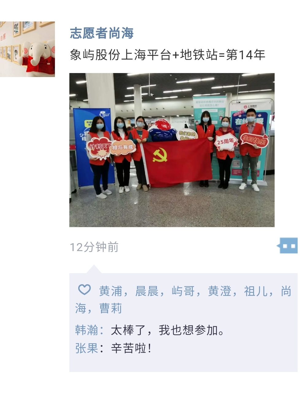 這是象嶼股份上海平臺志愿者走進地鐵站的第14個年頭。作為城市文明的先行者和宣傳者,志愿者們十四年如一日,堅持用真誠主動的服務(wù)為出行的乘客送上溫暖,讓“象嶼紅”成為地鐵站里一道亮麗的風景線。